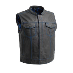Key Features: 0.9 - 1.0 mm soft Milled Cowhide Club style vest with banded collar, covered snaps and hidden cropped center zipper Two snap down chest pockets Two snap down slash pockets...