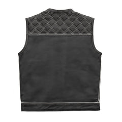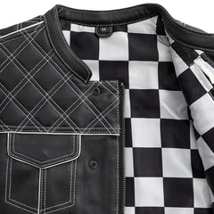 Key Features: Diamond Naked Cowhide Leather Club style with one inch collar, covered snaps and cropped center zipper Diamond stitching on shoulder White stitching White Leather piping on center and...