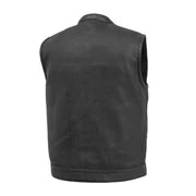Our best selling club vest is now built for summer. Stay cool and protected with perforated Diamond Naked Cowhide leather. The Sharpshooter has a banded collar, covered snaps and covered, cropped center zipper. Four pockets up front, and a single panel back with two conceal carry pockets.