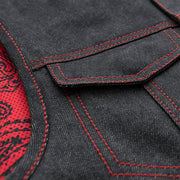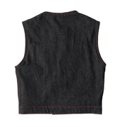 The Ember is a club style vest crafted from our Raw Charcoal Denim, that sits three inches shorter than a traditional vest. It has a roll up collar, covered snaps, and cropped center zipper. The three panel liner is a red and black paisley on mesh. It features two conceal carry pockets, easy access panels, and a back armor pocket.