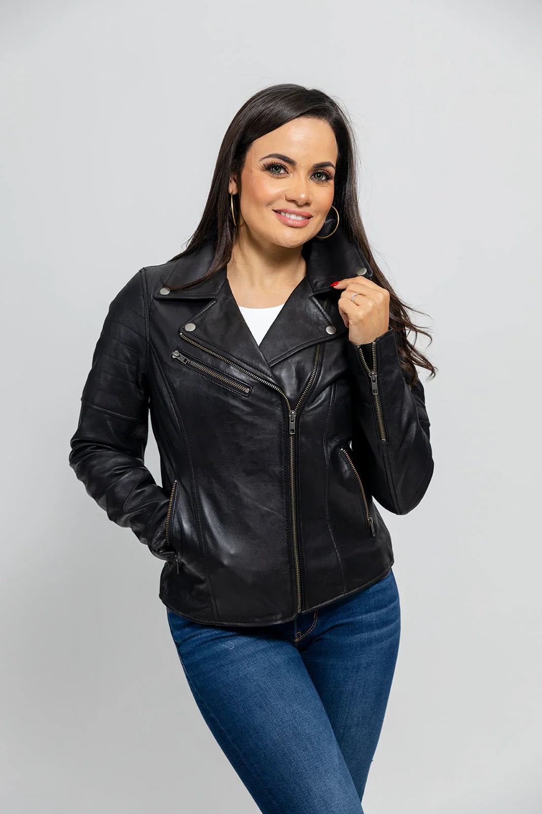 • Asymmetrical front zipper and snap lapel for a modern moto look