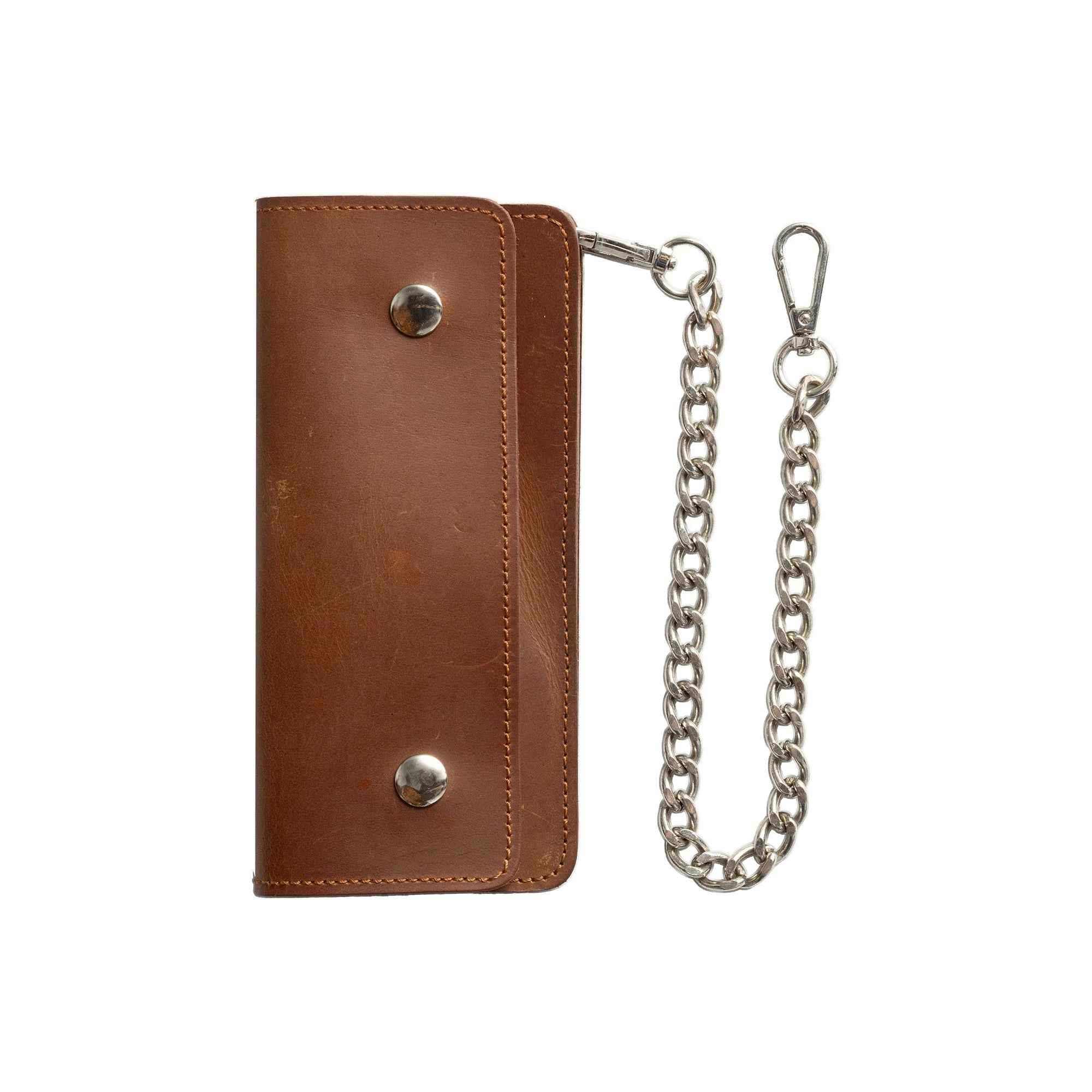 The Large Trucker wallet is the accessory of choice for the confident man who values practicality. This warm brown wallet is a timeless choice, and its size and proportions make a real impact when visible from the back pocket of your jeans or chinos. Designed to carry your daily necessities effortlessly, it has a single card slot, a zip pocket, and two large open pockets, all protected by a double snap closure for added security. The rust-resistant 15-inch chain adds an edgy touch, but is removable should you desire a slimmer silhouette or prefer to exchange it with your own. This leather wallet for gents is crafted as a byproduct from our belt division so it is a sustainable choice for the conscious consumer.