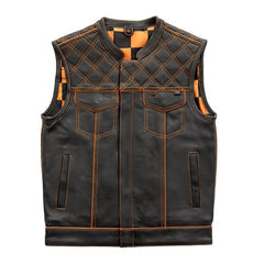 SKU: M050-BLKORNG-S Key Features: Diamond Naked Cowhide 1.2 - 1.3mm Leather Club style with one inch collar, covered snaps and cropped center zipper Diamond diamond stitching on shoulder Orange stitching Orange Leather piping...