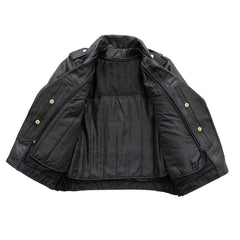 SKU: FIL150CDMZ-BLK-XS Key Features: 0.6-0.7mm Naked Cow Leather Motorcycle Style with snap down lapel, collar, epaulets and asymmetrical zipper One zippered, slanted chest pocket Two zippered lower slash pockets One coin patch...