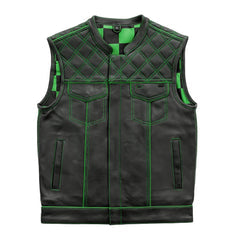 Key Features: Diamond Naked Cowhide Leather Club style with one inch collar, covered snaps and cropped center zipper Diamond diamond stitching on shoulder Green stitching Green Leather piping on center and...